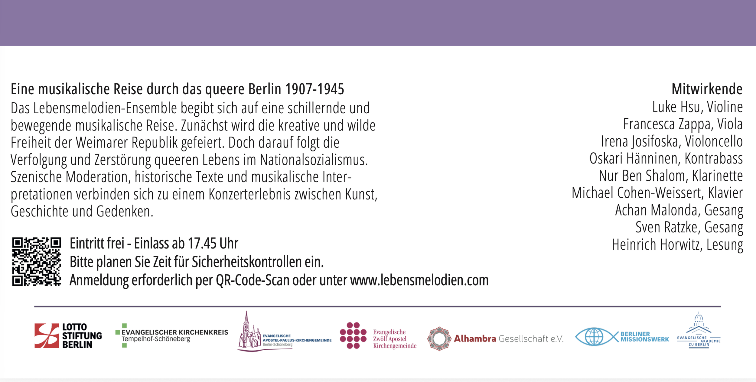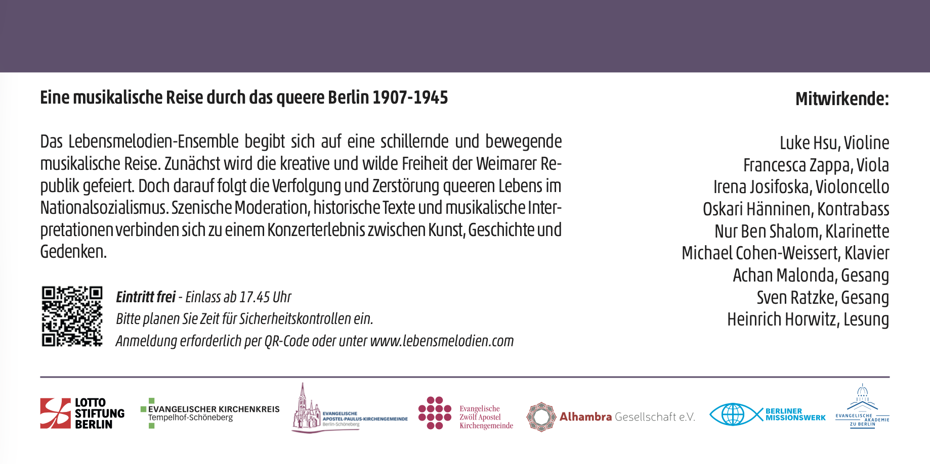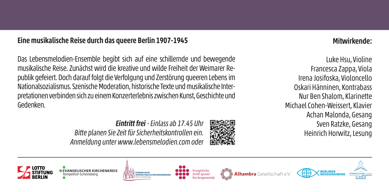 „Lebensmelodien“ – in den unmenschlichsten Situationen der Verfolgung und Ermordung, zwischen Leben und Tod, sind diese Melodien entstanden. Die Musik hat geholfen in den Ghettos und Lagern zu überleben – oder auch von dieser Welt Abschied zu nehmen. Hinter den Lebensmelodien, die im Zeitraum 1933–1945 komponiert oder gesungen, gespielt, manchmal auch aufgeschrieben wurden, verbergen sich die Lebensgeschichten jüdischer Schicksale.